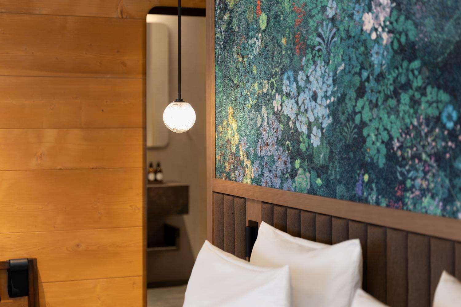 Toutes les maisons misent sur les textiles haut de gamme de Jakob Schlaepfer : papiers peints, rideaux, linge de lit et autres éléments caractérisent l'ambiance.